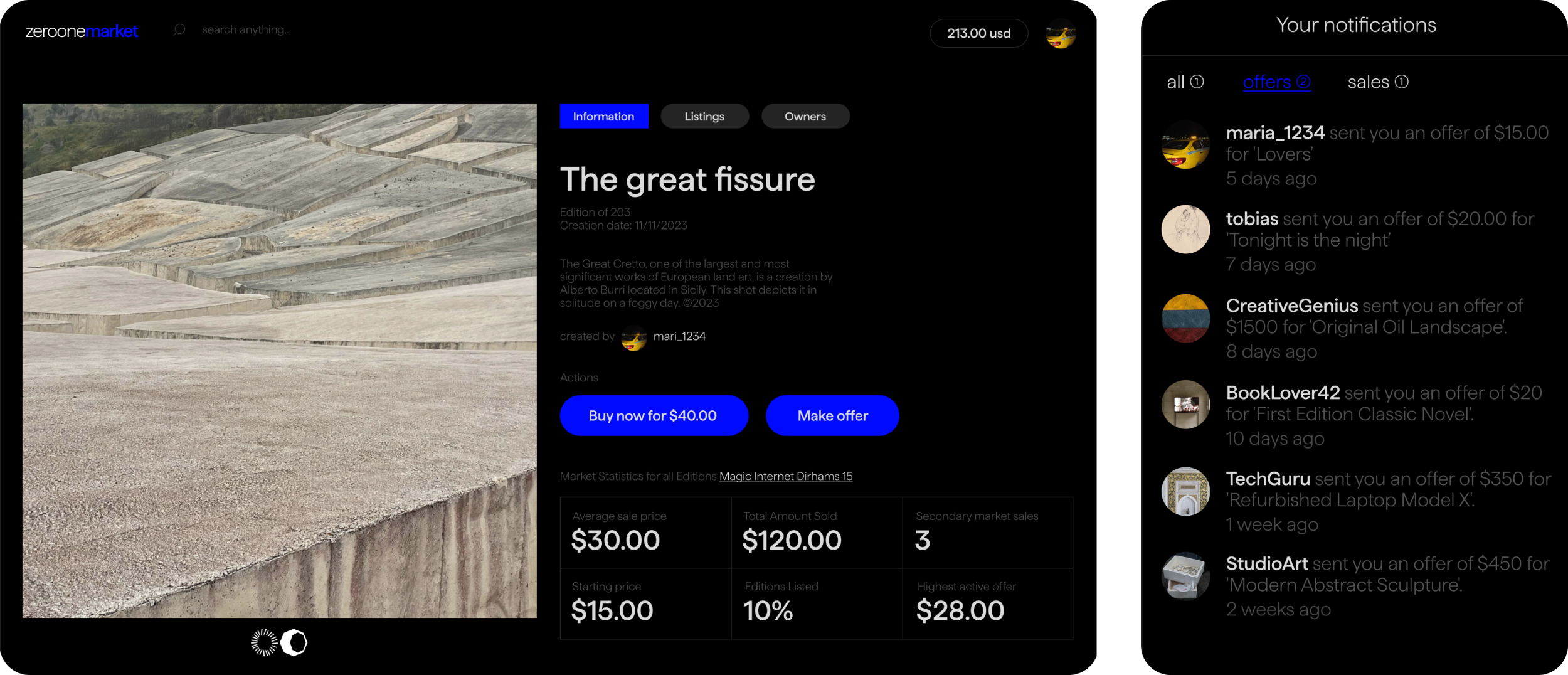 Creators can mint their work, turning it into valuable, ownable assets. Collectors and enthusiasts can support and invest in their favorite artists through the zeroone market. Together, we foster economic alignment and value creation.